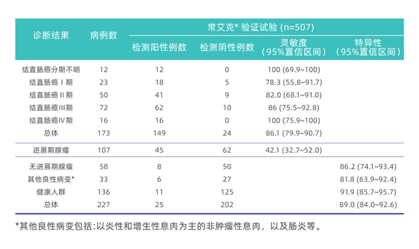 常艾克® 检测结直肠癌(I-IV期)的综合灵敏度为86%(149/173)
