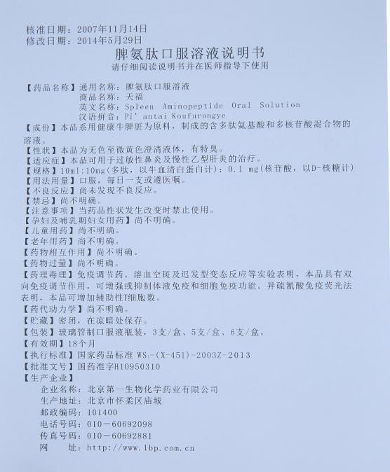 想要了解一种药,首先我们来看它的生产企业。从说明书我们能看到脾氨肽口服溶液的生产企业是北京第一生物化学药业有限公司(简称第一生物)。第一生物是我国医疗界有代表性的高科技医疗企业,产学研为一体,常年与国内外知名的医药院校合作。第一生物始建于1958北京大学成立校办的生化药厂,有着悠久发展历史和“国家级高新技术企业”及“中国生化制药工业协会副会长单位”等多种荣誉的企业生产并上市多年的药品——脾氨肽口服溶液,想其安全性一定不会差!