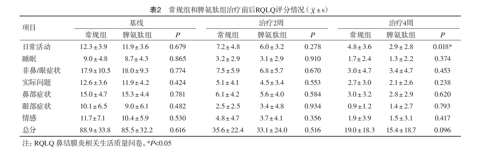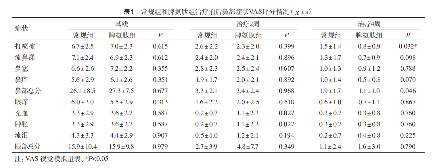 研究结果显示,4周治疗后脾氨肽口服溶液组鼻部打喷嚏、流鼻涕及鼻塞等症状较常规组明显减轻(1.1±1.0 vs 1.9±1.7,P=0.046);生活质量较常规组明显改善(15.4±18.7vs19.0±18.3,P=0.096);细胞因子IL-17A较常规组升高(1.7±1.2 vs 3.9±6.1,P=0.012);抗组胺药物、鼻用糖皮质激素用量较常规组显著减少(P<0.05)。