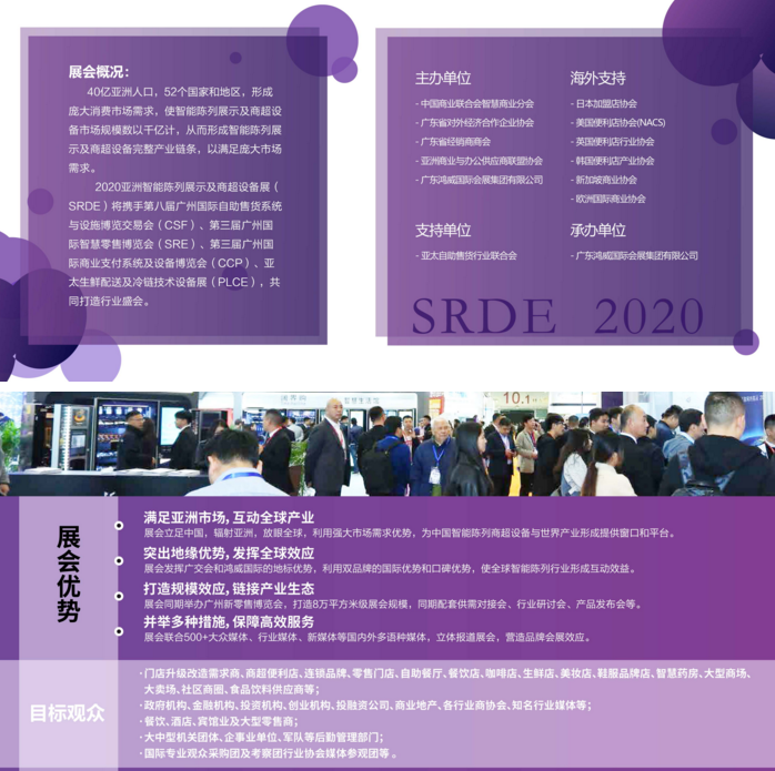 模数以千亿计,从而形成智能陈列展示及商超设备完整产业链条,以满足庞大市场需求。2020亚洲智能陈列展示及商超设备展(srde)将携手第八届广州国际自助售货系统与设施博览交易会(csf)、第三届广州国际智慧零售博览会(sre)、第三届广州国际商业支付系统及设备博览会(ccp)、亚太生鲜配送及冷链技术设备展(plce),共同打造行业盛会。【主办单位】中国商业联合会智慧商业分会|广东省对外经济合作企业协会|广东省经销商商会 |亚洲商业与办公供应商联盟协会|广东鸿威国际会展集团有限公司