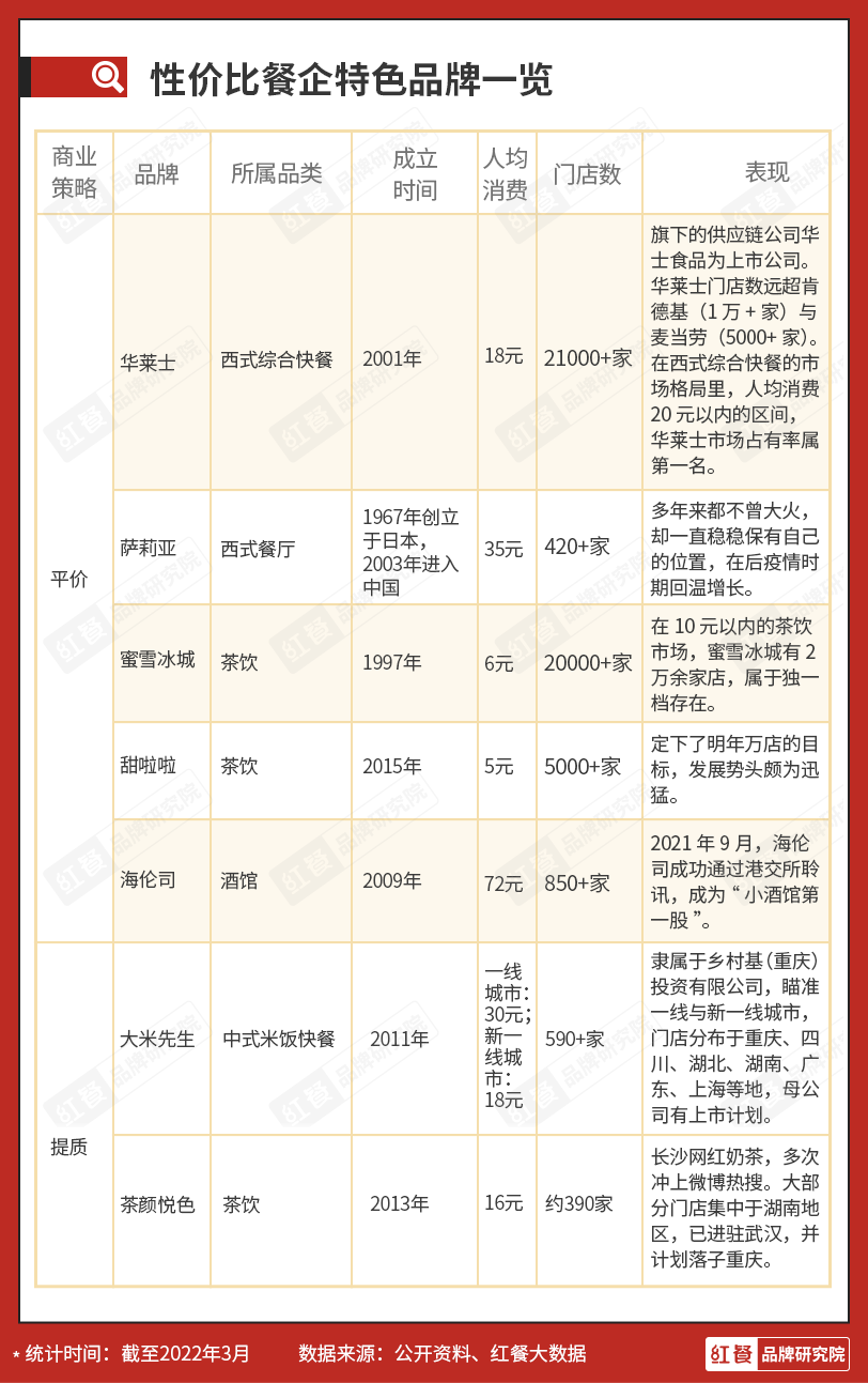 同时,在其他餐饮赛道,依靠平价化策略崛起的例子也有很多。譬如在华莱士崛起之前,西式快餐市场上的平价连锁品牌不多,肯德基、麦当劳等品牌的产品售价也不是所有消费者都能承受得了的;在萨莉亚出现之前,国内市场人均消费在50元以内的西餐厅并不多见;在海伦司突围之前,行业中时兴的也是人均百元的酒馆。